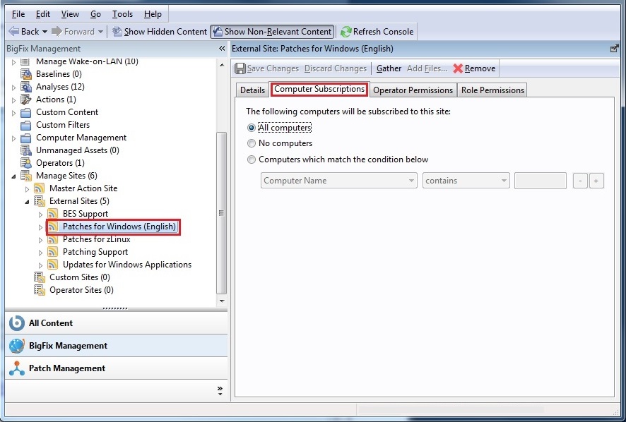 The Patch Management site is now listed in the Manage Sites node of the domain panel. - Open the Manage Sites node and select Patches for Windows (English).