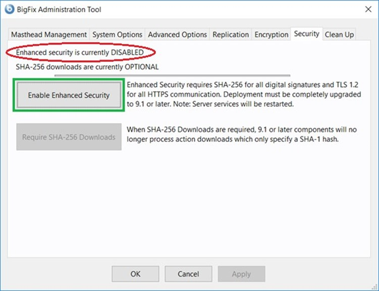 On Windows, you can enable the "Enhanced Security" using the relevant button of the graphical BigFix Administration Tool, as shown in the following picture: