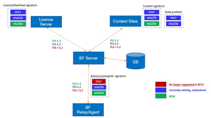 - BigFix Platform 11 will support both TLS 1.2 and TLS 1.3 (with TLS 1.3 being always the first attempted option), while it will no longer support TLS 1.1 or below in ANY scenario requiring HTTPS.