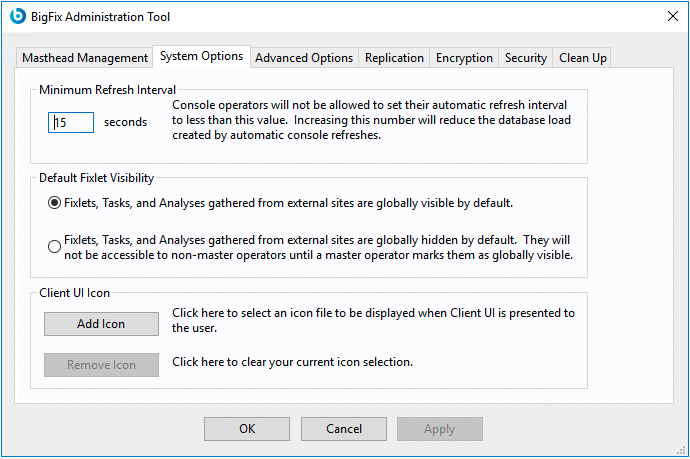 The first option sets a baseline minimum for refresh intervals. This refers to the Fixlet list refresh period specified in the Preferences dialog of the Console. The default period is 15 seconds, but if your network can handle the bandwidth, you can lower this number to make the Console more responsive. Conversely, if your network is strained, you might want to increase this minimum.