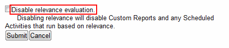 It is cleared by default. If checked, all relevance evaluation in custom reports and in any scheduled activities is disabled. Click Submit to set the option.