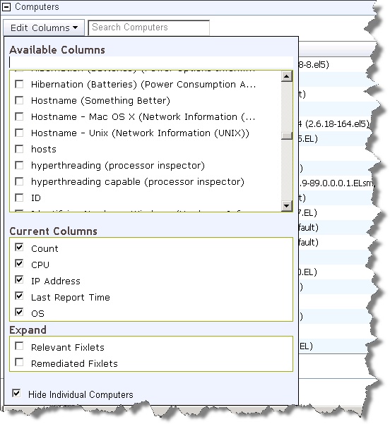The Expand section lets you add Relevant or Remediated Fixlet messages to the Computer list. Note that there is a check box to Hide Individual Computers, which lists the computer count instead of individual computer names.