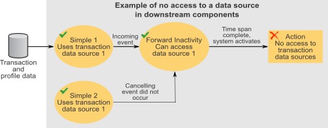 A Forward Inactivity component uses incoming and canceling events generated by two Simple components. In the Forward Inactivity's value selector, you can use the transaction data source made available through the component that supplies the incoming event. However, components that are downstream from the Forward Inactivity component have no access to this data source.