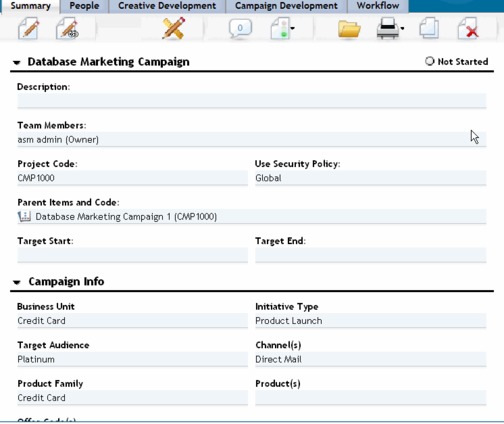 • The fields in the top portion of the tab (the Database Marketing Campaign section) are standard attributes. When creating the object, users enter this information on the template's Properties tab.