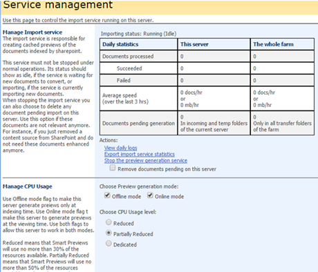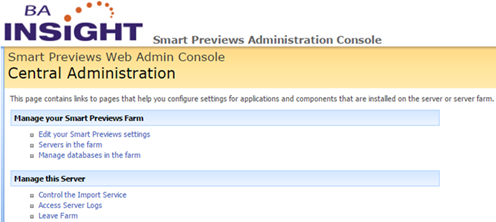 - The Smart Previews Web Administration Console - Central Administration page appears.
