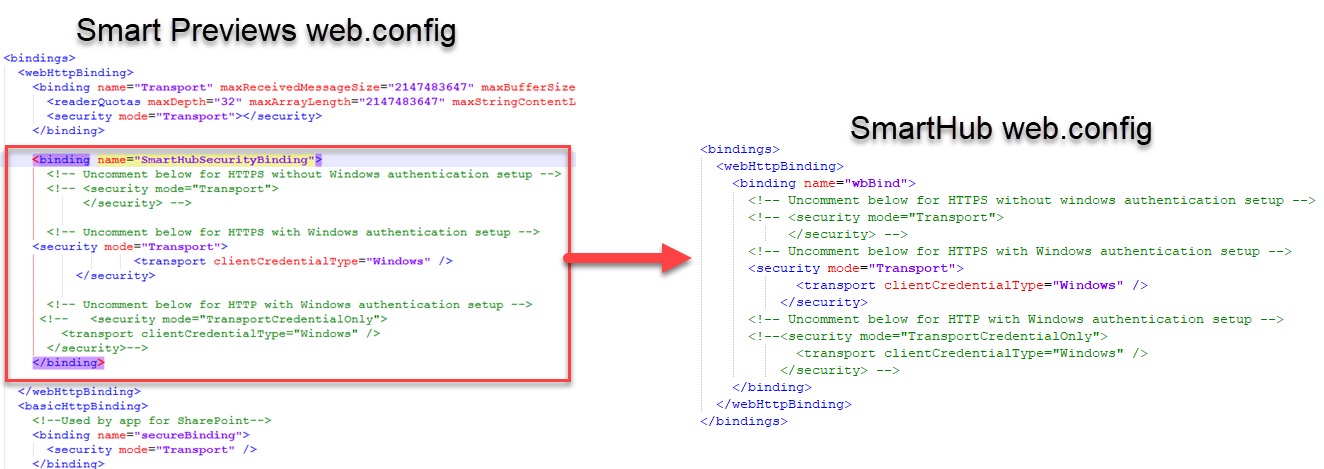 - In the example below, the security binding in both files is set to "HTTPS with Windows authentication setup."