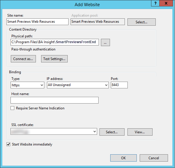 - You must configure the Smart Previews Web Resources site to reference the SmartHub URL that is accessible from the server where the Smart Previews Web Resources are being installed.