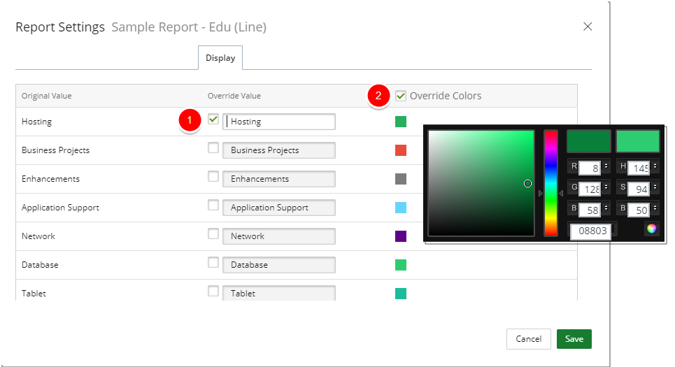 - Original Label Value: Select the checkbox next to the label you want to override and type the new label in the Override Value box.