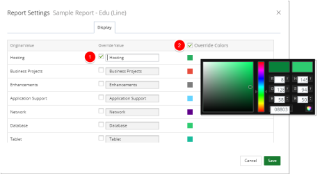 - Override Colors: Use this checkbox to override the colors on the chart. Select the checkbox and then click on the color and make a new color selection.