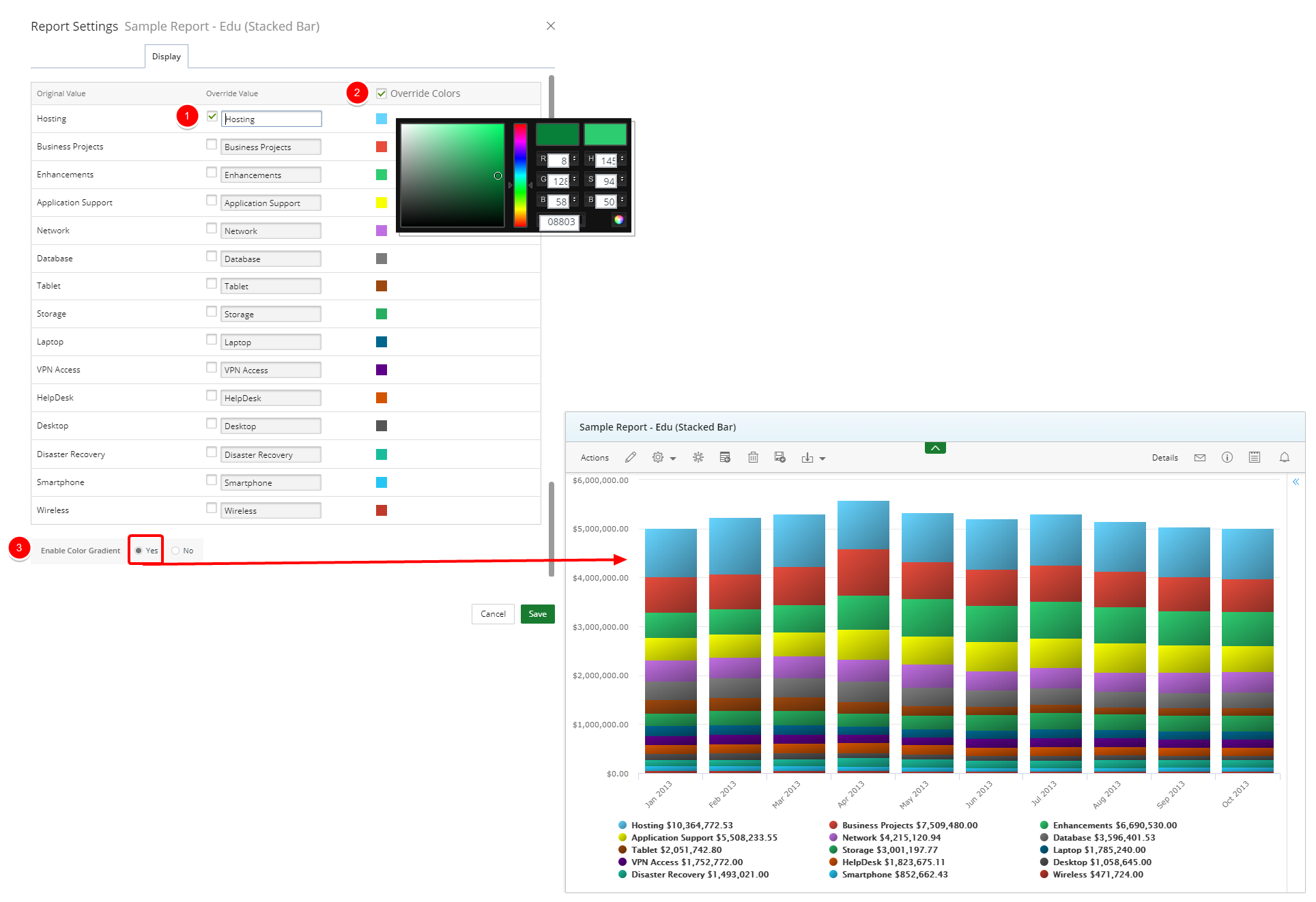 - Override Colors: Use this checkbox to override the colors on the chart. Select the checkbox and then click on the color and make a new color selection.
