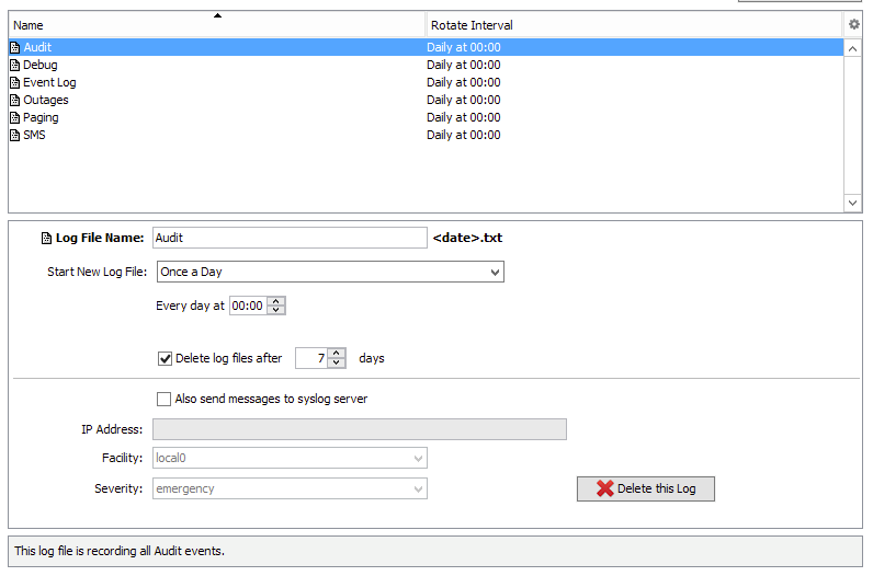 To delete a log file, select a log file definition and click Delete this Log. The log file definition is removed from the list.