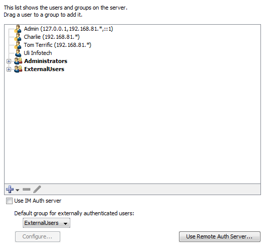 The following example shows a typical user and group configuration in the Users panel of the Server Settings window: