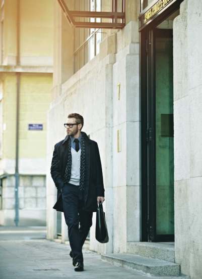 Raincoat, Loft Design By, £360; shirt, Calvin Klein Jeans, £69; cardigan, Canali, £270; tie, DKNY, price on request;