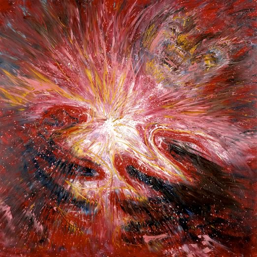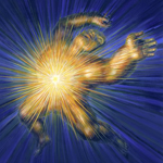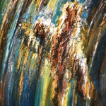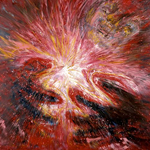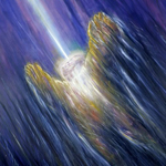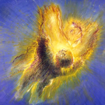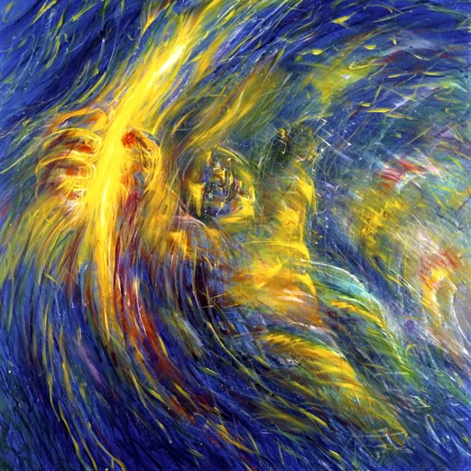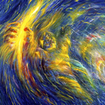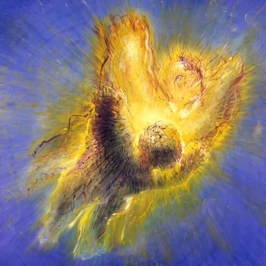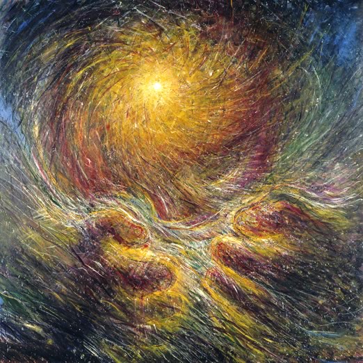 In the opening works on display this month, the human being is presented as woven into the Light-fabric of the Kosmos, able to reflect on, engage, and celebrate the paradox of being One with what is and also determinately Other. In Spark a figure holds a yellow beam; its body shimmering with this very color—Light holding Light—human being joyously knowing the source of its own essence, the essence of All.