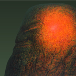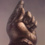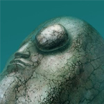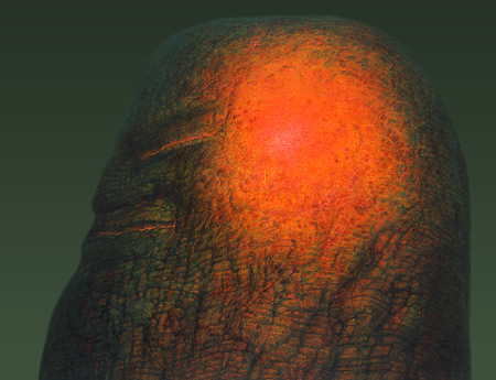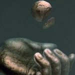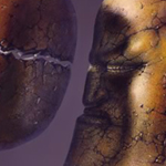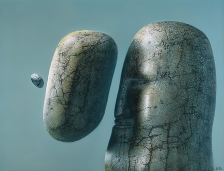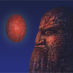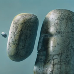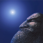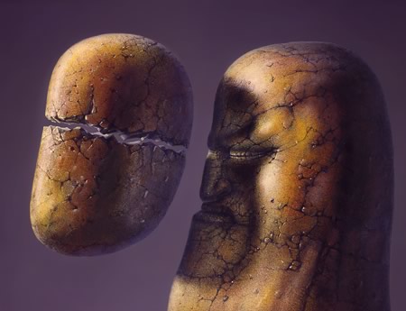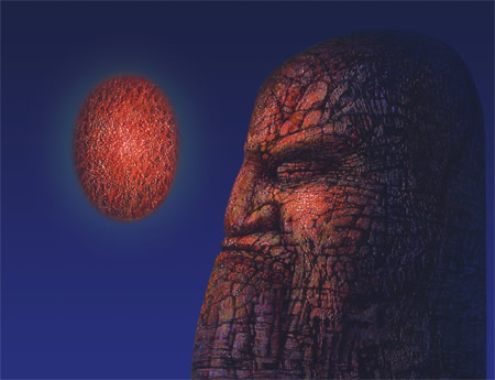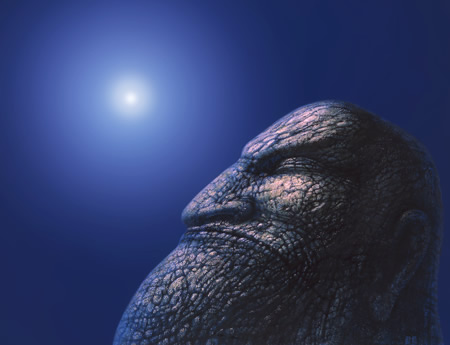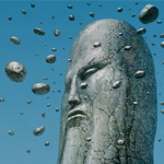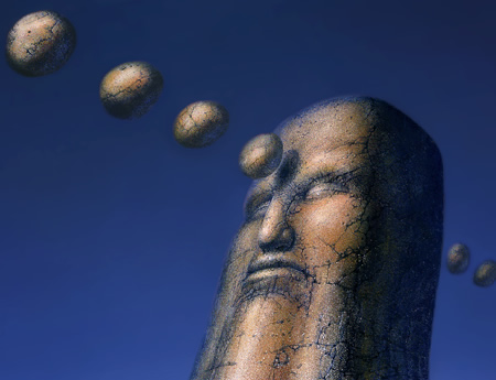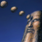 In the second group of works on display, Stone rather than Light is the central metaphor for the essential substance of humanity. In Thinking we view from below a monolithic human head located in clear blue sky. Smaller stones orbit the head, human being and thought made of the same stuff. The face is dignified, the monolithic form majestic; with the status of thinking nonetheless withdrawing from immediate sense. Stone lacks an "inside"—the philosopher Heidegger called the element of Earth "the self-concealing"1—for when one breaks stone one finds only more stone, an elemental movement signaling a mysterious and impenetrable opacity. What then are we to make of the dignity of thinking?—the orbiting stones around the head are indeed like a solar system in vast empty expanse, Kosmic in effect; yet all the while finite and limited in being proper to this single human presence.