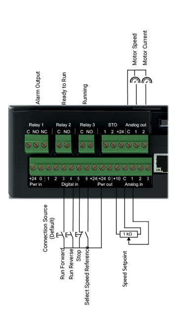 2-wires, 3-wires, preset control modesThere are 2 wiring presets with their software configuration selectable by the user.The default preset is the 3-wires configuration.3-wires connection⚓NoteKnown restriction⚓This software version does not include the 2-wires preset.A future update will add this selection to the Clean Power VFD.