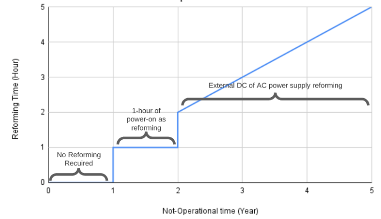 If the Clean Power VFD has been stocked (non-operational) for more than 2 years, refer to the following diagram to select the reforming time:
