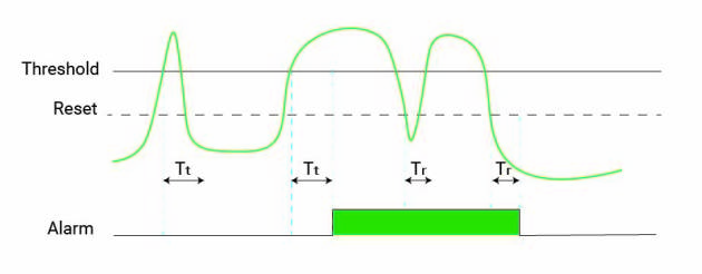 If the value exceeding the threshold lasts less than the Trigger delay (Tt), then the alarms doesn't trigger.