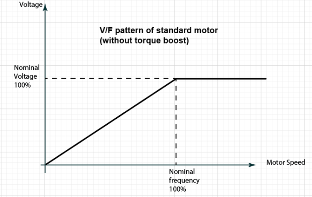 Users can set higher voltage (torque boost ) as indicated with the solid line in the figure below to cover the shortage of the torque at low speed.