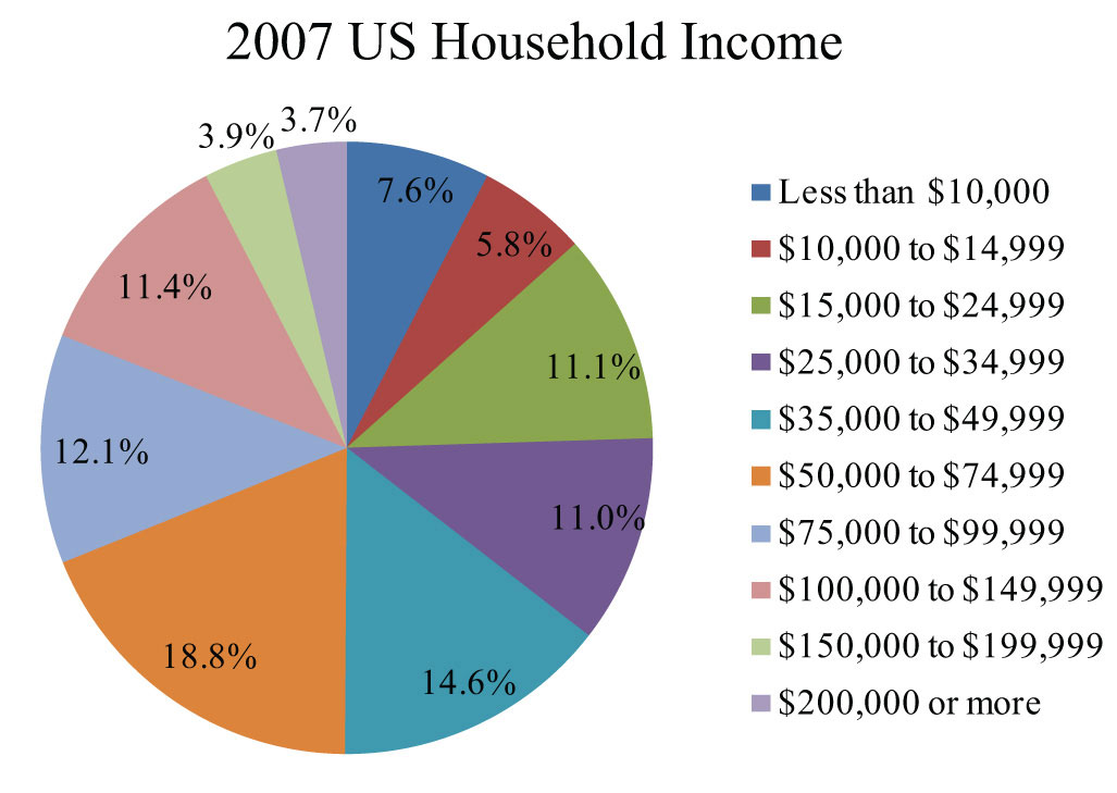 The pie chart below depicts all US households categorized by income. The total number of households in 2007 was about 111,600,000. Use the chart to answer the following questions.