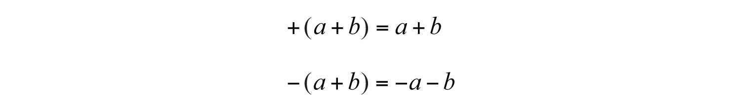 Often we will encounter algebraic expressions like or . As we have seen, the coefficients are actually implied to be +1 and −1, respectively, and therefore, the distributive property applies using +1 or –1 as the factor. Multiply each term within the parentheses by these factors: