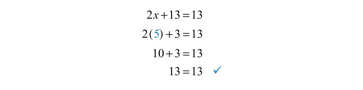 Alternatively, when an equation is equal to a constant, we can verify a solution by substituting the value for the variable and show that the result is equal to that constant. In this sense, we say that solutions satisfy the equationAfter replacing the variable with a solution and simplifying, it produces a true statement..