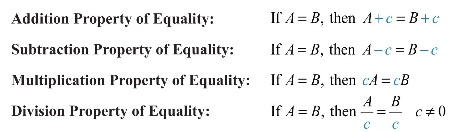 To do this, use the properties of equalityProperties that allow us to obtain equivalent equations by adding, subtracting, multiplying, and dividing both sides of an equation by nonzero real numbers.. Given algebraic expressions A and B, where c is a real number, we have the following: