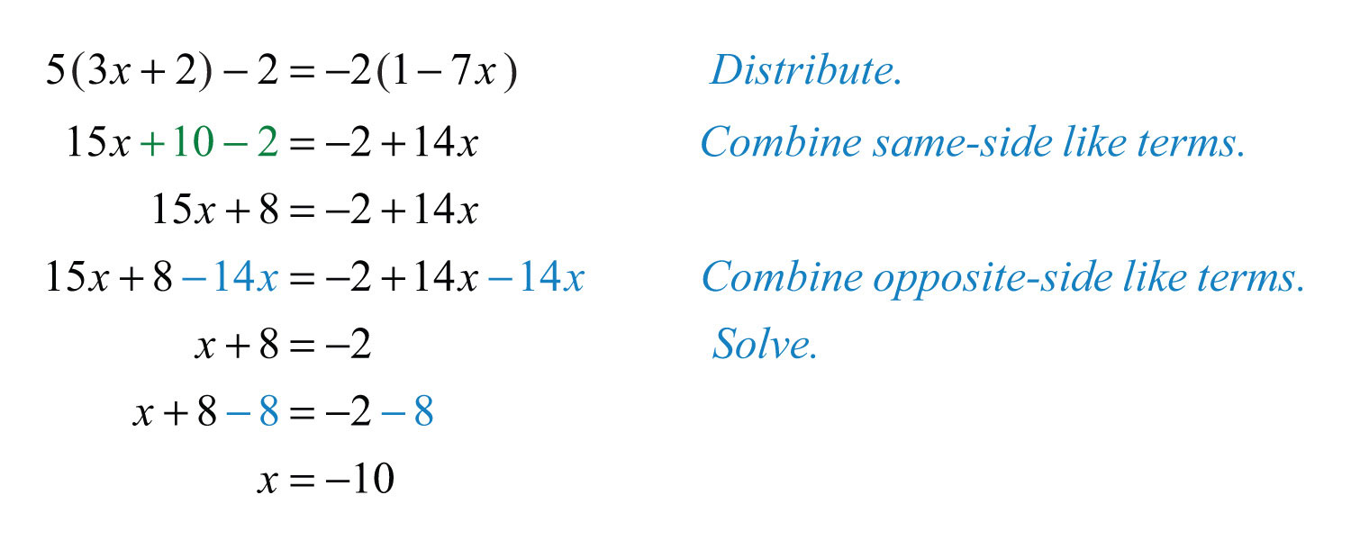 We will often encounter linear equations where the expressions on each side of the equal sign can be simplified. Typically, this involves combining same-side like termsLike terms of an equation on the same side of the equal sign.. If this is the case, then it is best to simplify each side first before solving.