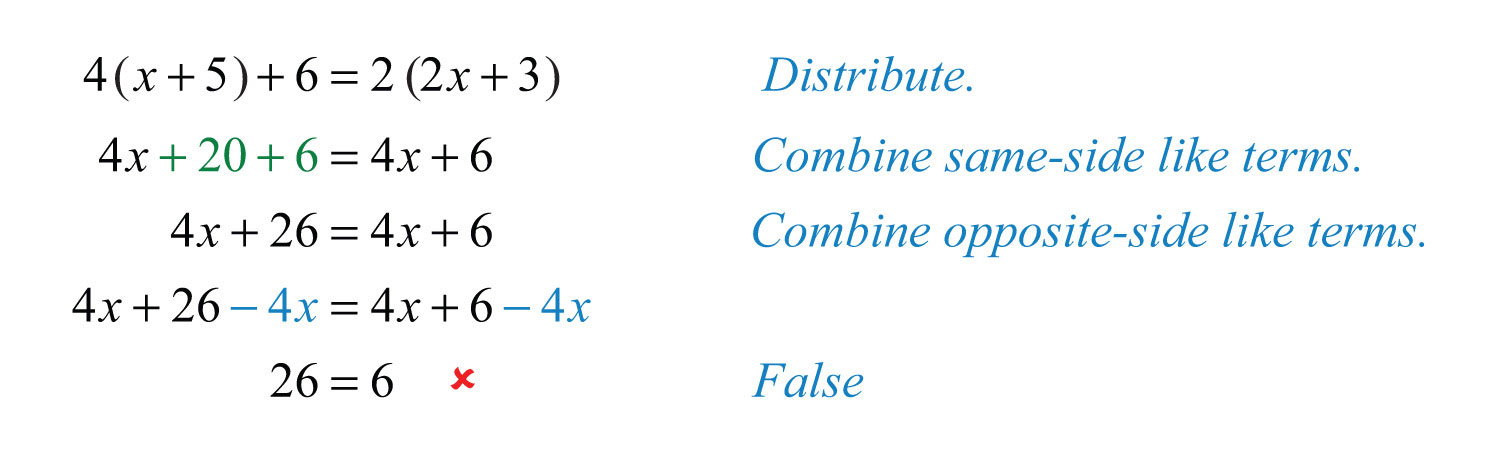 Answer: . Solving leads to a false statement; therefore, the equation is a contradiction and there is no solution.