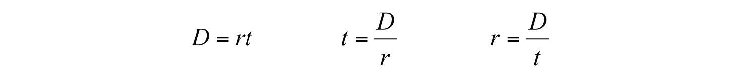 If we divide both sides by t, we obtain the formula . Use this formula to find the rate, given the distance traveled and the time it takes to travel that distance. Using the techniques learned up to this point, we now have three equivalent formulas relating distance, average rate, and time: