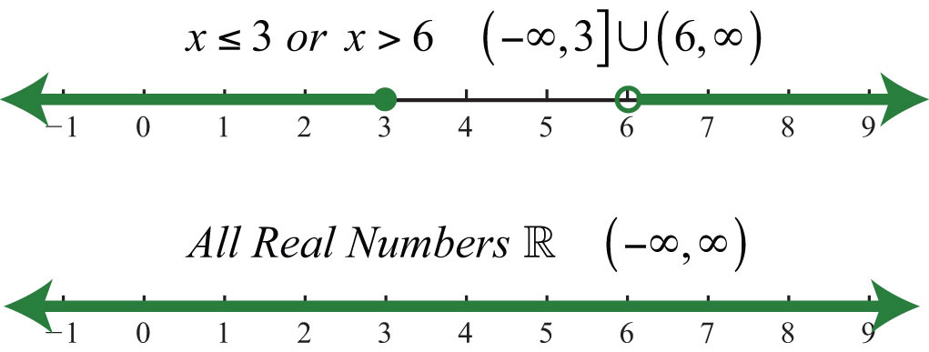 To describe compound inequalities such as , write , which is read “the set of all real numbers x such that x is less than 3 or x is greater than or equal to 6.”