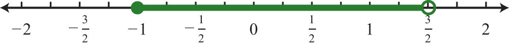 Solution: Determine the intersection, or overlap, of the two solution sets. The solutions to each inequality are sketched above the number line as a means to determine the intersection, which is graphed on the number line below.