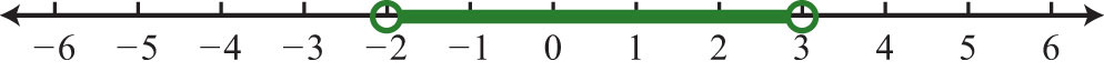 Alternatively, we may interpret as all possible values for x between or bounded by −1 and 3 on a number line. For example, one such solution is . Notice that 1 is between −1 and 3 on a number line, or that −1 < 1 < 3. Similarly, we can see that other possible solutions are −1, −0.99, 0, 0.0056, 1.8, and 2.99. Since there are infinitely many real numbers between −1 and 3, we must express the solution graphically and/or with interval notation, in this case .