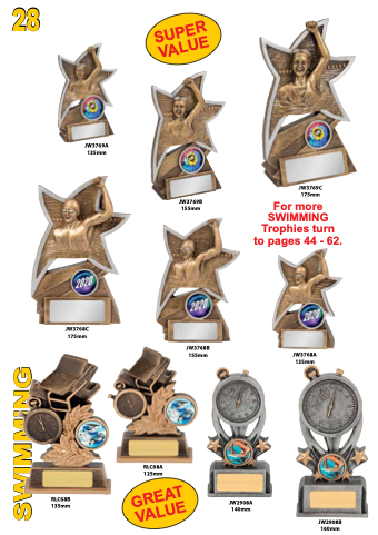 28 JW3769A 135mm JW3769B 155mm JW3769C 175mm For more SWIMMING Trophies turn to pages 44 - 62. JW3768A 135mm JW3768C 175mm JW3768B 155mm RLC68A 125mm RLC68B 135mm JW2908A 140mm JW2908B 160mm GREAT VALUE SUPER VALUE SWIMMING