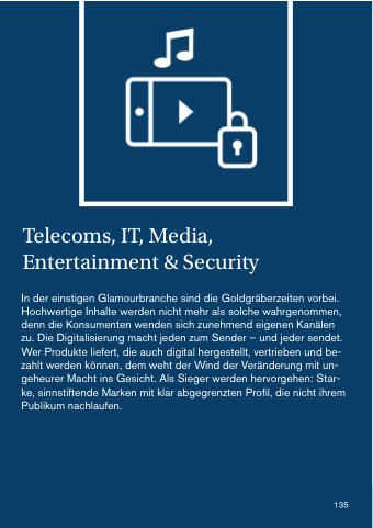 In der einstigen Glamourbranche sind die Goldgräberzeiten vorbei. Hochwertige Inhalte werden nicht mehr als solche wahrgenommen, denn die Konsumenten wenden sich zunehmend eigenen Kanälen zu. Die Digitalisierung macht jeden zum Sender – und jeder sendet. Wer Produkte liefert, die auch digital hergestellt, vertrieben und be- zahlt werden können, dem weht der Wind der Veränderung mit un- geheurer Macht ins Gesicht. Als Sieger werden hervorgehen: Star- ke, sinnstiftende Marken mit klar abgegrenzten Profil, die nicht ihrem Publikum nachlaufen.