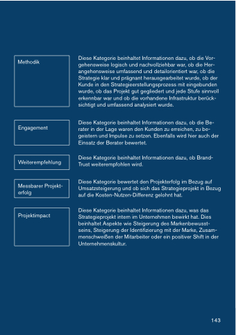 Diese Kategorie beinhaltet Informationen dazu, ob die Vor- gehensweise logisch und nachvollziehbar war, ob die Her- angehensweise umfassend und detailorientiert war, ob die Strategie klar und prägnant herausgearbeitet wurde, ob der Kunde in den Strategieerstellungsprozess mit eingebunden wurde, ob das Projekt gut gegliedert und jede Stufe sinnvoll erkennbar war und ob die vorhandene Infrastruktur berück- sichtigt und umfassend analysiert wurde.