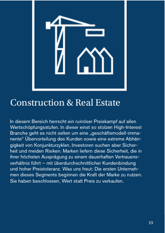In diesem Bereich herrscht ein ruinöser Preiskampf auf allen Wertschöpfungsstufen. In dieser einst so stolzen High-Interest Branche geht es nicht selten um eine „geschäftsmodell-imma- nente“ Übervorteilung des Kunden sowie eine extreme Abhän- gigkeit von Konjunkturzyklen. Investoren suchen aber Sicher- heit und meiden Risiken. Marken liefern diese Sicherheit, die in ihrer höchsten Ausprägung zu einem dauerhaften Vertrauens- verhältnis führt – mit überdurchschnittlicher Kundenbindung und hoher Preistoleranz. Was uns freut: Die ersten Unterneh- men dieses Segments beginnen die Kraft der Marke zu nutzen. Sie haben beschlossen, Wert statt Preis zu verkaufen.