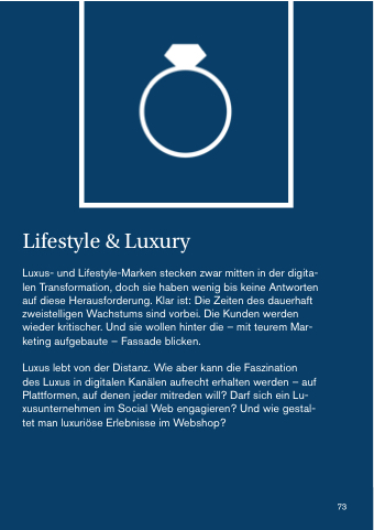 Luxus lebt von der Distanz. Wie aber kann die Faszination des Luxus in digitalen Kanälen aufrecht erhalten werden – auf Plattformen, auf denen jeder mitreden will? Darf sich ein Lu- xusunternehmen im Social Web engagieren? Und wie gestal- tet man luxuriöse Erlebnisse im Webshop?