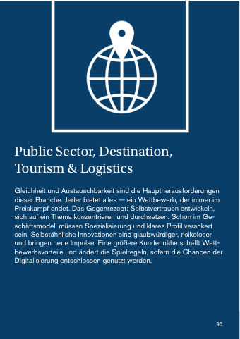 Gleichheit und Austauschbarkeit sind die Hauptherausforderungen dieser Branche. Jeder bietet alles — ein Wettbewerb, der immer im Preiskampf endet. Das Gegenrezept: Selbstvertrauen entwickeln, sich auf ein Thema konzentrieren und durchsetzen. Schon im Ge- schäftsmodell müssen Spezialisierung und klares Profil verankert sein. Selbstähnliche Innovationen sind glaubwürdiger, risikoloser und bringen neue Impulse. Eine größere Kundennähe schafft Wett- bewerbsvorteile und ändert die Spielregeln, sofern die Chancen der Digitalisierung entschlossen genutzt werden.