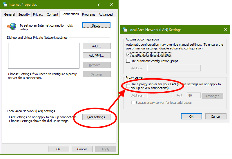 To manually fix your proxy settings, open Internet Explorer, then go to the Tools menu (or gear icon), Internet Options → Connections tab → LAN Settings button. Then remove the checkmark beside “Use a proxy server for your LAN”.