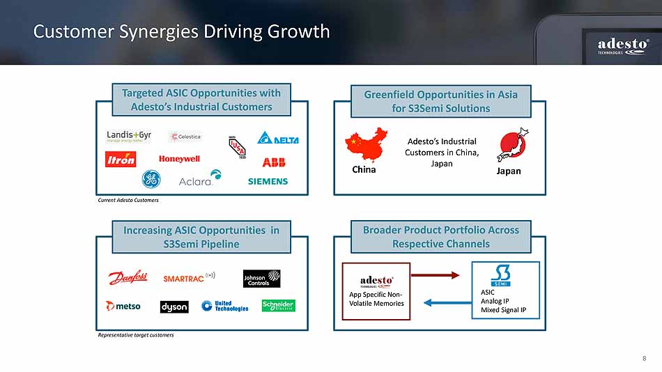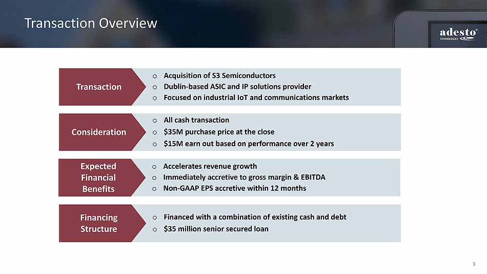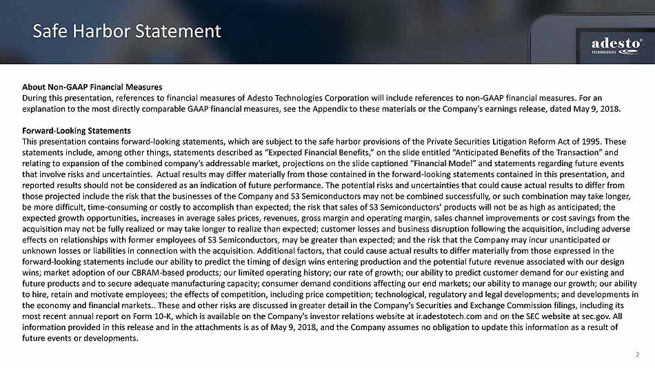 2 Safe Harbor Statement About Non - GAAP Financial Measures During this presentation, references to financial measures of Adesto Technologies Corporation will include references to non - GAAP financial measures. For an explanation to the most directly comparable GAAP financial measures, see the Appendix to these materials or the Company’s ear nin gs release, dated May 9, 2018. Forward - Looking Statements This presentation contains forward - looking statements, which are subject to the safe harbor provisions of the Private Securities Litigation Reform Act of 1995. These statements include, among other things, statements described as “Expected Financial Benefits,” on the slide entitled “Anticip ate d Benefits of the Transaction” and relating to expansion of the combined company’s addressable market, projections on the slide captioned “Financial Model” and sta tements regarding future events that involve risks and uncertainties. Actual results may differ materially from those contained in the forward - looking statemen ts contained in this presentation, and reported results should not be considered as an indication of future performance. The potential risks and uncertainties that cou ld cause actual results to differ from those projected include the risk that the businesses of the Company and S3 Semiconductors may not be combined successfully, o r s uch combination may take longer, be more difficult, time - consuming or costly to accomplish than expected; the risk that sales of S3 Semiconductors’ products will not be as high as anticipated; the expected growth opportunities, increases in average sales prices, revenues, gross margin and operating margin, sales channel imp rovements or cost savings from the acquisition may not be fully realized or may take longer to realize than expected; customer losses and business disruption fo llo wing the acquisition, including adverse effects on relationships with former employees of S3 Semiconductors, may be greater than expected; and the risk that the Comp any may incur unanticipated or unknown losses or liabilities in connection with the acquisition. Additional factors, that could cause actual results to diff er materially from those expressed in the forward - looking statements include our ability to predict the timing of design wins entering production and the potential future revenue associated with our design wins; market adoption of our CBRAM - based products; our limited operating history; our rate of growth; our ability to predict cus tomer demand for our existing and future products and to secure adequate manufacturing capacity; consumer demand conditions affecting our end markets; our abil ity to manage our growth; our ability to hire, retain and motivate employees; the effects of competition, including price competition; technological, regulatory an d l egal developments; and developments in the economy and financial markets.. These and other risks are discussed in greater detail in the Company's Securities and Exc han ge Commission filings, including its most recent annual report on Form 10 - K, which is available on the Company's investor relations website at ir.adestotech.com and on the SEC website at sec.gov. All information provided in this release and in the attachments is as of May 9, 2018, and the Company assumes no obligation to up dat e this information as a result of future events or developments.