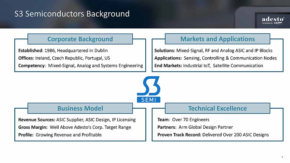 3 Transaction Overview o Financed with a combination of existing cash and debt o $35 million senior secured loan Financing Structure o All cash transaction o $35M purchase price at the close o $15M earn out based on performance over 2 years Consideration o Acquisition of S3 Semiconductors o Dublin - based ASIC and IP solutions provider o Focused on industrial IoT and communications markets Transaction o Accelerates revenue growth o Immediately accretive to gross margin & EBITDA o Non - GAAP EPS accretive within 12 months Expected Financial Benefits