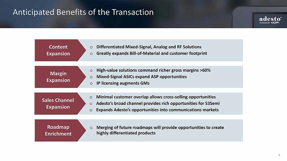 4 S3 Semiconductors Background Corporate Background Established : 1986, Headquartered in Dublin Offices : Ireland, Czech Republic, Portugal, US Competency : Mixed - Signal, Analog and Systems Engineering Solutions : Mixed - Signal, RF and Analog ASIC and IP Blocks Applications: Sensing, Controlling & Communication Nodes End Markets: Industrial IoT, Satellite Communication Markets and Applications Team : Over 70 Engineers Partners : Arm Global Design Partner Proven Track Record: Delivered Over 200 ASIC Designs Business Model Technical Excellence Revenue Sources: ASIC Supplier, ASIC Design, IP Licensing Gross Margin: Well Above Adesto’s Corp. Target Range Profile: Growing Revenue and Profitable