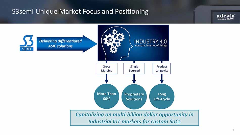 5 Anticipated Benefits of the Transaction o Merging of future roadmaps will provide opportunities to create highly differentiated products Roadmap Enrichment o High - value solutions command richer gross margins >60% o Mixed - Signal ASICs expand ASP opportunities o IP licensing augments GMs Margin Expansion o Differentiated Mixed - Signal, Analog and RF Solutions o Greatly expands Bill - of - Material and customer footprint Content Expansion o Minimal customer overlap allows cross - selling opportunities o Adesto’s broad channel provides rich opportunities for S3Semi o Expands Adesto’s opportunities into communications markets Sales Channel Expansion