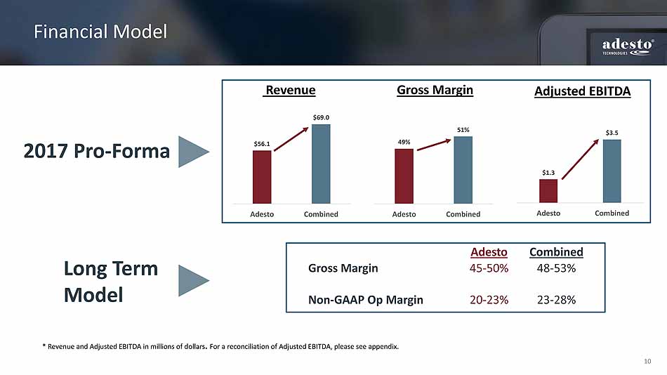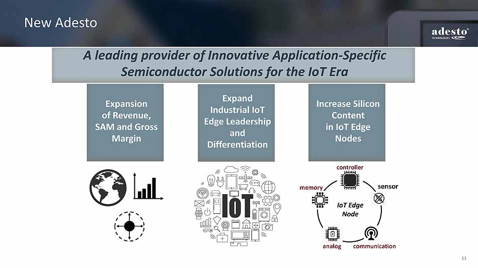 10 Financial Model Revenue Adjusted EBITDA Gross Margin $56.1 $69.0 Adesto Combined 49% 51% Adesto Combined Adesto Combined Gross Margin 45 - 50% 48 - 53% Non - GAAP Op Margin 20 - 23% 23 - 28% * Revenue and Adjusted EBITDA in millions of dollars . For a reconciliation of Adjusted EBITDA, please see appendix. 2017 Pro - Forma Long Term Model $1.3 $3.5 Adesto Combined