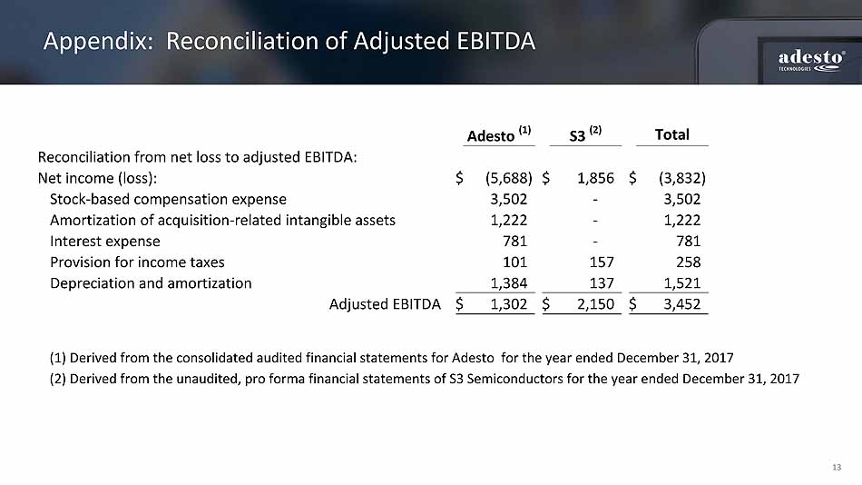 13 Appendix: Reconciliation of Adjusted EBITDA Adesto (1) S3 (2) Total Reconciliation from net loss to adjusted EBITDA:    Net income (loss):   $ (5,688) $ 1,856 $ (3,832) Stock-based compensation expense    3,502 - 3,502 Amortization of acquisition-related intangible assets 1,222 - 1,222 Interest expense    781 - 781 Provision for income taxes    101 157 258 Depreciation and amortization 1,384 137 1,521 Adjusted EBITDA $ 1,302 $ 2,150 $ 3,452 (1) Derived from the consolidated audited financial statements for Adesto for the year ended December 31, 2017 (2) Derived from the unaudited, pro forma financial statements of S3 Semiconductors for the year ended December 31, 2017