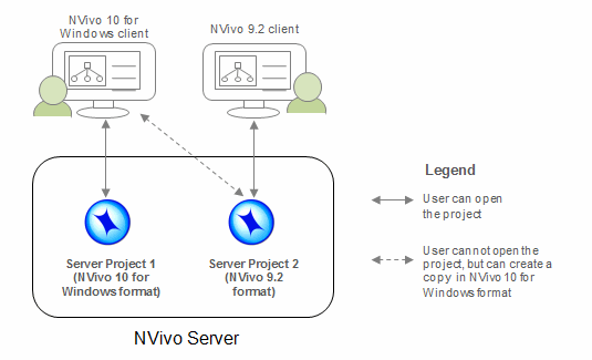 NVivo Server 10 and NVivo Server 10 R2 permit connections from any version of the NVivo 10 for Windows and NVivo 9 client software and can host projects in all NVivo 10 Windows and NVivo 9 formats.