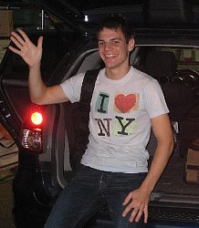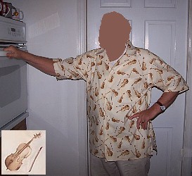 mother sent him this handmade shirt full of cellos--modeled here by an
