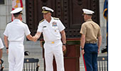 The beginning of June marked the change of command for the U.S. Naval Academy Commandant of Midshipmen. RADM T.R. Buchanan ’92, USN, finished his two-year term on the Yard and was relieved by Col James “J.P” McDonough III ’94, USMC. Col McDonough assumed his duties as the 89th Commandant of Midshipmen during a ceremony located in T-Court. Prior to his arrival at the Academy, he served as executive assistant to the Deputy Commandant of Plans, Policies and Operations at the U.S. Marine Corps Headquarters in the Pentagon. McDonough earned a master’s degree in modeling, virtual environments and simulation from the Naval Postgraduate School in 2005 and graduated with distinction from the Eisenhower School for National Security and Resource Strategy at National Defense University in 2014. Bravo Zulu to both RADM Buchanan and Col McDonough! |