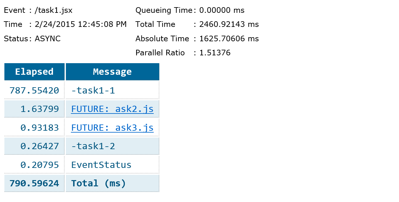 Queueing Time: time spend waiting in the thread pool queue before this task could be processed (in milliseconds).Cumulative Time: the total serial computation time of this task and all its descendant tasks (in milliseconds).Absolute Time: the difference between the end time of the last descendant task and the beginning time of this task (in milliseconds).Parallel Ratio: the speedup of the parallel execution.